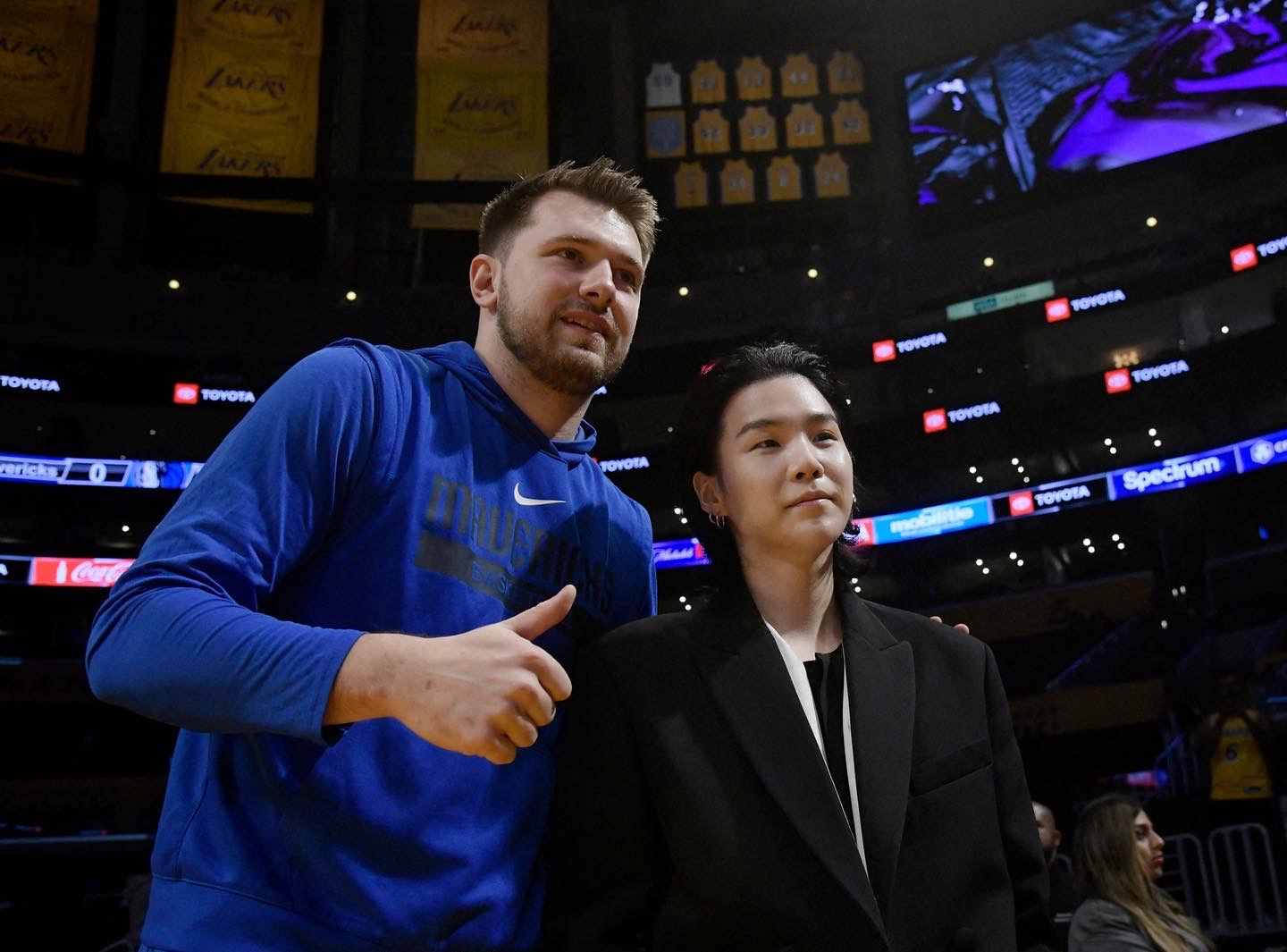 슈가는 패션 관련 행사 참석을 위해 LA를 방문했던 것으로 알려졌다. 그 시간을 쪼개고 쪼개 NBA, LA 레이커스와 댈러스 매버릭스 경기를 직관하기 위해 현장을 찾은 것이다. 슈가는 최근 연일 상종가를 찍고 있는 슈퍼스타 루카 돈치치와 함께 사진을 찍으며 이날을 기념하기도 했다. 레이커스 측은 슈가의 이름이 박힌 특별한 유니폼을 선물하기도 했다.