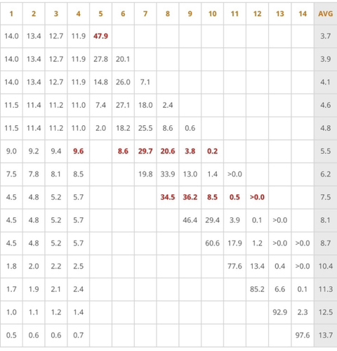 각 순위별 로터리픽 추첨 확율 (위에서 밑으로 1~14위), 빨간색 글씨는 의미 없어요