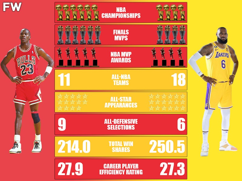 주요 수상내역(우승,MVP 개수 및 수비왕),임팩트,실력 모두 조던.