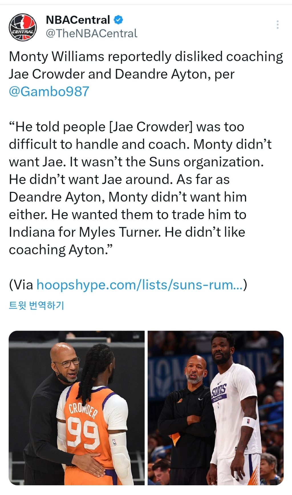 몬티 윌리엄스는 재 크라우더와 디안드레 에이튼의 코칭을 싫어한 것으로 알려졌습니다
