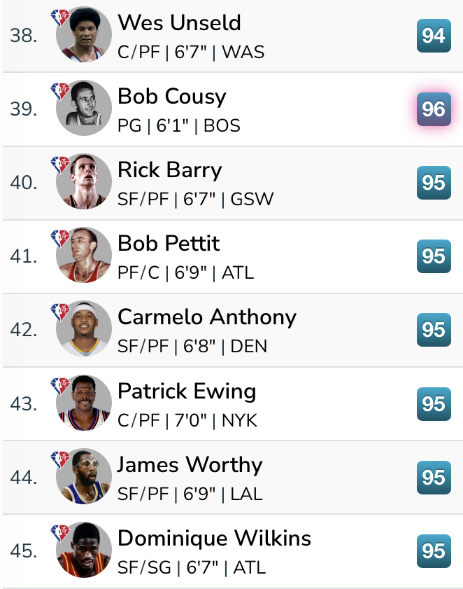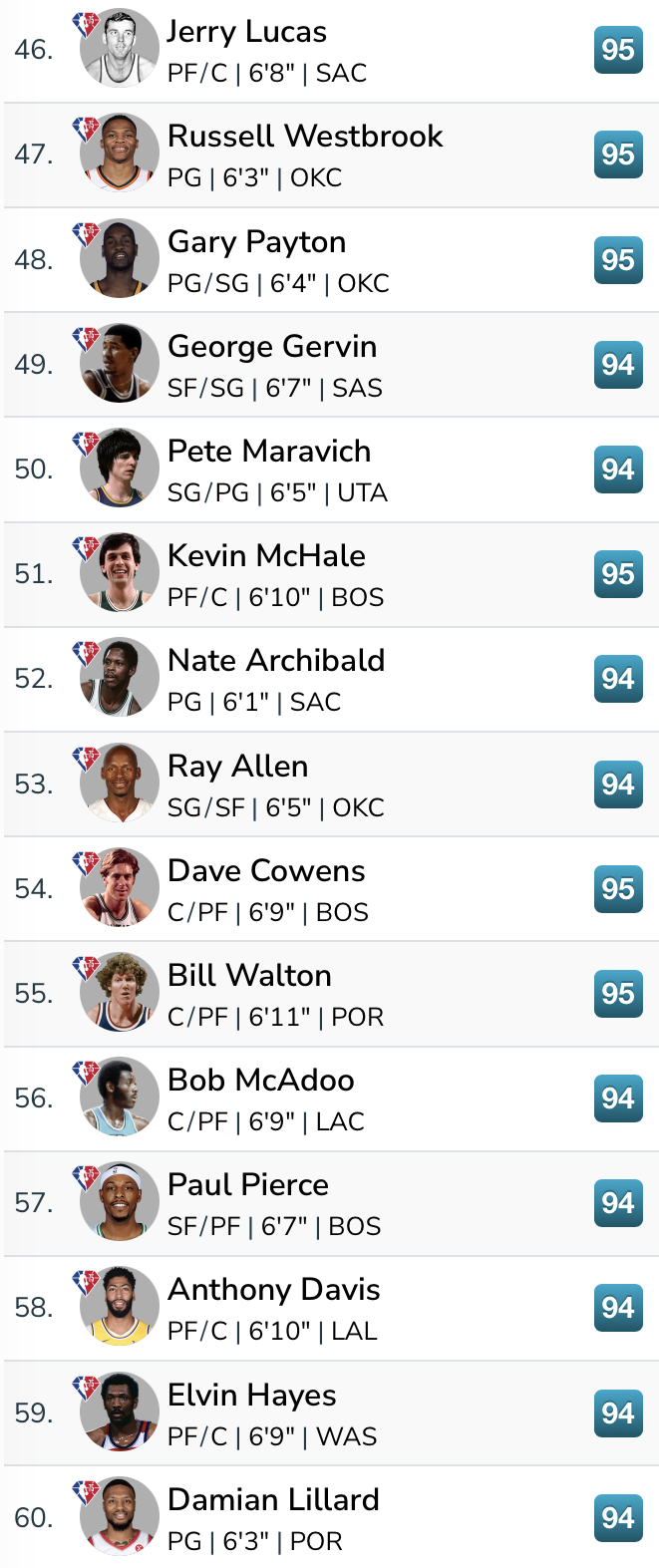 작성자mourning33 작성시간 23.10.17 밥 맥카두가 많이 낮네요. 1번의 MVP, 2번의 MVP 2등, 2회 챔프인 그에게 94는 쫌 짜보입니다. 피스톨 피트도 더 올려야할 것 같고요