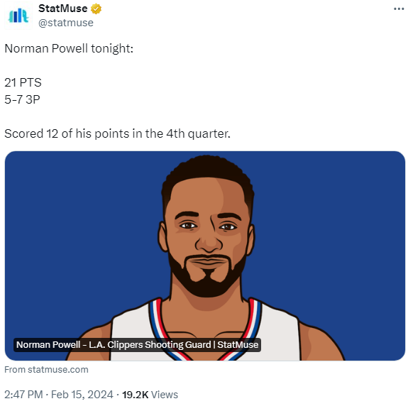 "4쿼터 3점 4개" 노만 파웰의 오늘 경기 스탯 및 하이라이트.gif 작성자Melo|작성시간24.02.15|조회수643 목록 댓글 3 글자크기 작게가 글자크기 크게가 21득점, 3점 5개. 4쿼터에만 4개의 3점을 연속으로 성공시키면서 역전승을 이끌었네요. 왜 수비가 자꾸 파웰쪽을 놓친건지 이해가 안됩니다..ㅠㅠ https://twitter.com/statmuse/status/1758005028839706851 다음검색 현재 게시글 추가 기능 열기 북마크 공유하기 신고 센터로 신고 댓글 댓글 3 댓글쓰기 답글쓰기 댓글 리스트 작성자Fluke | 작성시간 24.02.15 전부 너무 심하게 놓쳐서 어이가 없었던.. 작성자Shoot as Ray | 작성시간 24.02.15 클리퍼스의 캐사기 캐릭 벤치죠 ㄷㄷㄷ 오늘은 서부룩 센터도 어마어마 ㄷㄷㄷ 작성자개뿔 | 작성시간 24.02.15 첫번째 짤 제외하고 그렇게 쉬운 난이도는 아니었는데 넘 깔끔하다… 댓글 전체보기