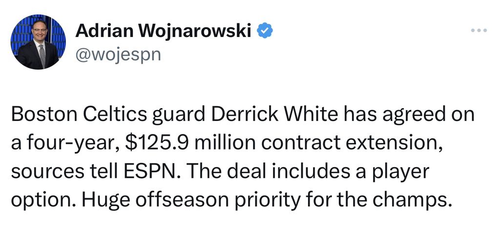 [BOS] 데릭 화이트, Celtics와 4년 125.9밀 연장 계약 합의 작성자(CHI)불타는개고기|작성시간24.07.02|조회수1,369 목록 댓글 3 글자크기 작게가 글자크기 크게가 선수 옵션 포함25/26부터 시작하는 맥스 연장 계약임X의 Adrian Wojnarowski님(@wojespn)Boston Celtics guard Derrick White has agreed on a four-year, $125.9 million contract extension, sources tell ESPN. The deal includes a player option. Huge offseason priority for the champs.x.comX의 Bobby Marks님(@BobbyMarks42)Here’s the extension breakdown on Derrick White. The $125.9M (including likely bonuses) was the maximum allowed. 2025/26- $28.1M 2026/27- $30.4M 2027/28- $32.6M 2028/29- $34.8Mx.com 다음검색 현재 게시글 추가 기능 열기 북마크 공유하기 신고 센터로 신고 댓글 댓글 3 댓글쓰기 답글쓰기 댓글 리스트 작성자오른손도 거들뿐 | 작성시간 24.07.02 반지도 얻고 계약도 대박이고 작성자Melo | 작성시간 24.07.02 보스턴 집토끼들 확실히 잡고 리핏도 노리고 구단도 팔고(?) 작성자gogo!!! | 작성시간 24.07.02 이친구는 이것도 싸게 보이는건 왜죠? 정말 탐나는 선수입니다 댓글 전체보기