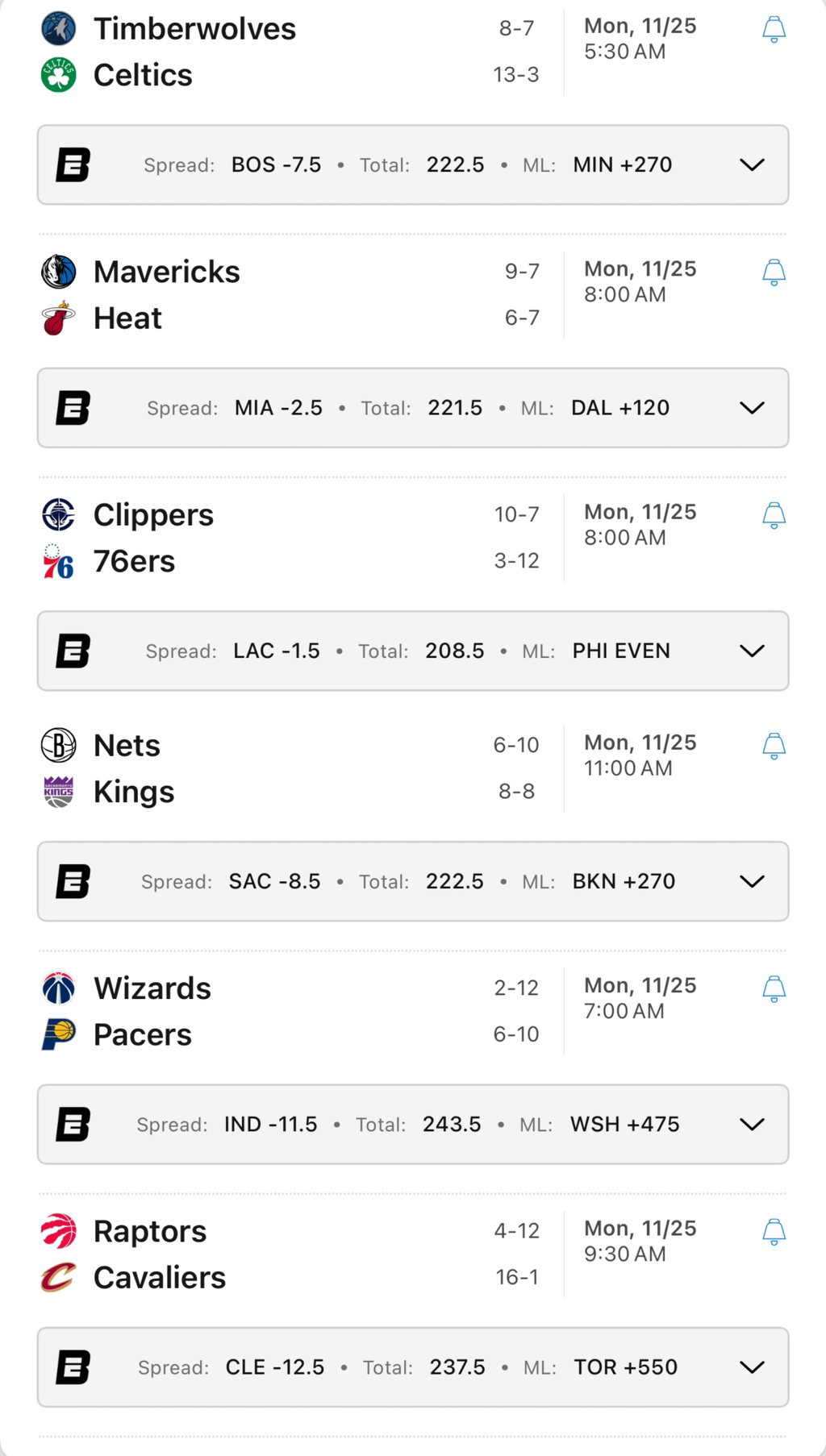 내일 11/25 경기 일정 (총 6경기)