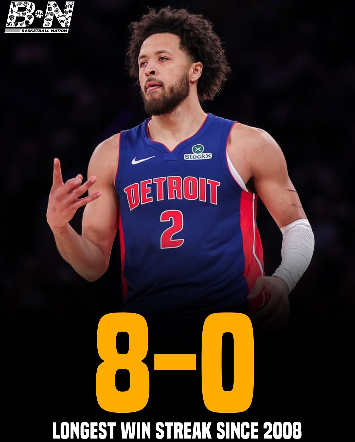 현지시각 25년 2월 26일에 치뤄진 보스턴과의 홈경기에서 말릭 비즐리와 47득점을 합작하면서 117-97로 승리를 쟁취, 07-08시즌이후 17년만에 정규시즌 8연승에 성공했는데 디펜딩 챔피언이자 6연승을 달리던 보스턴을 상대로 100점 이하로 막으면서 쟁취한 승리이기에 의미가 크며 불과 1년전만 해도 리그 전체 꼴지 30위팀 디트로이트가 무려 동부 5위에 올라와 있는 것은 에이스인 커닝햄의 뛰어난 활약이 핵심적이라고 볼 수 있습니다.