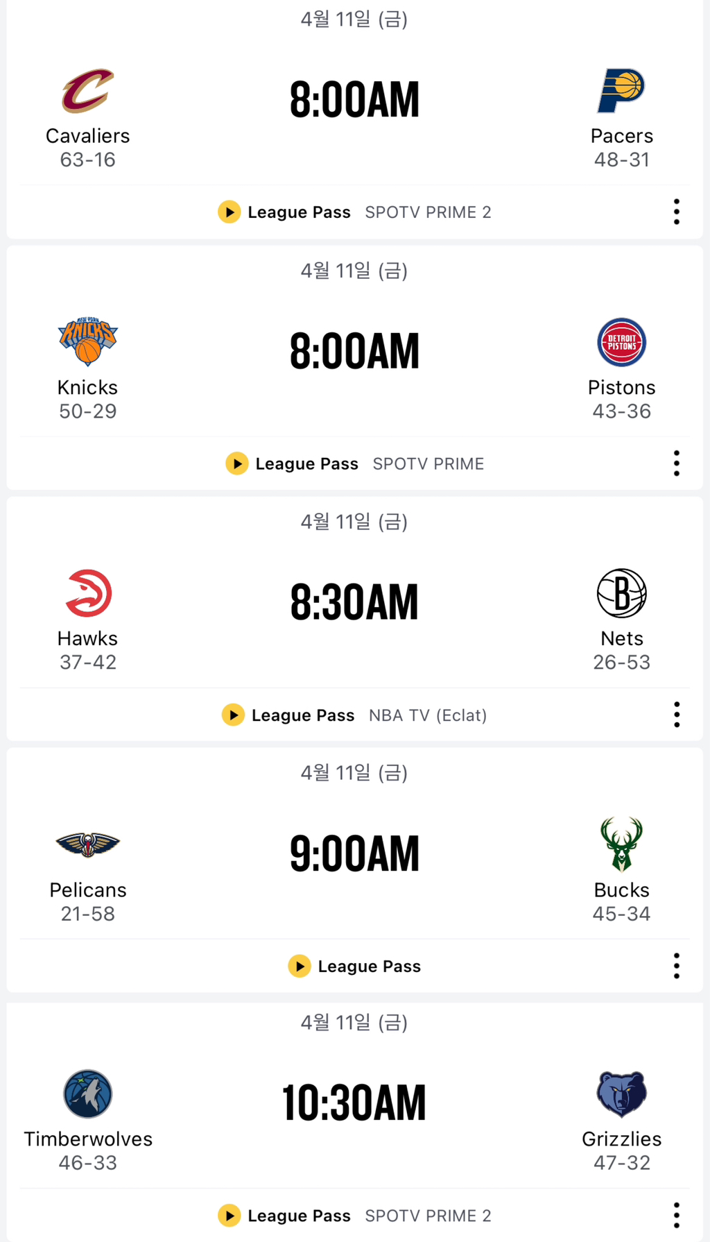 내일 4/11 경기 일정 (총 5경기)