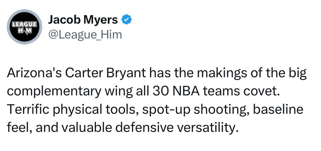 Arizona's Carter Bryant has the makings of the big complementary wing all 30 NBA teams covet. Terrific physical tools, spot-up shooting, baseline feel, and valuable defensive versatility. pic.twitter.com/B0ZkY1B1cn