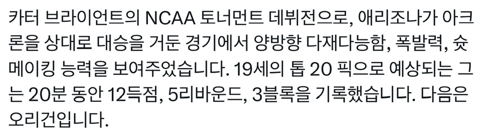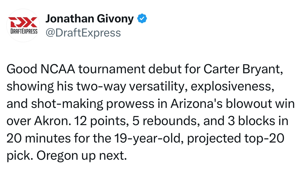 Good NCAA tournament debut for Carter Bryant, showing his two-way versatility, explosiveness, and shot-making prowess in Arizona's blowout win over Akron. 12 points, 5 rebounds, and 3 blocks in 20 minutes for the 19-year-old, projected top-20 pick. Oregon up next. pic.twitter.com/wi13z3WkLH