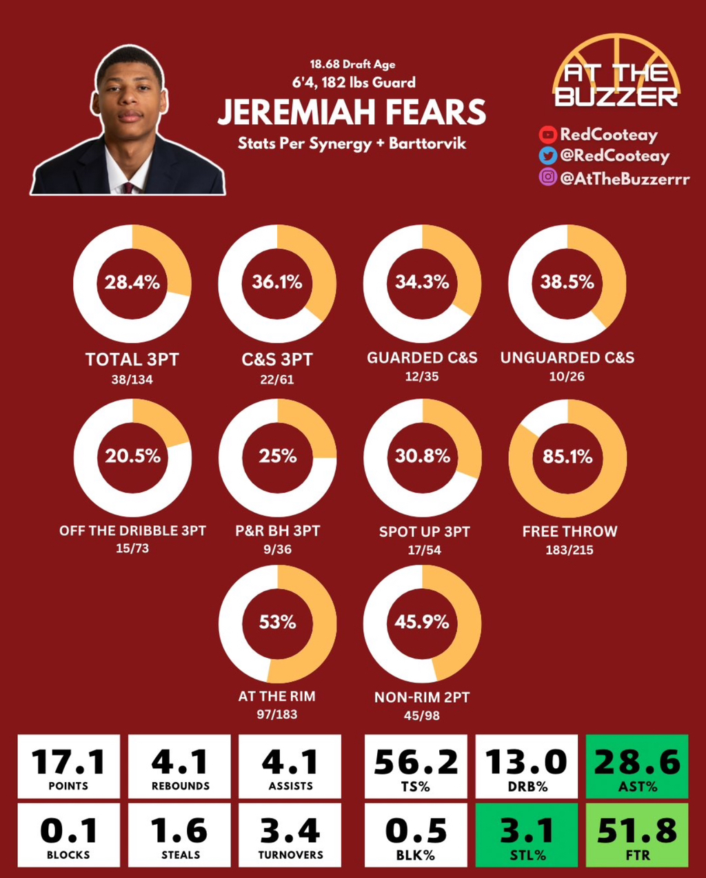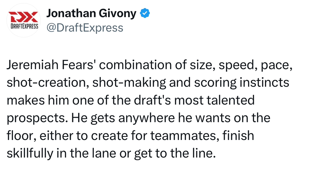 Jeremiah Fears' combination of size, speed, pace, shot-creation, shot-making and scoring instincts makes him one of the draft's most talented prospects. He gets anywhere he wants on the floor, either to create for teammates, finish skillfully in the lane or get to the line. https://t.co/OAFOdtcra0 pic.twitter.com/pLyvSZ1AlP