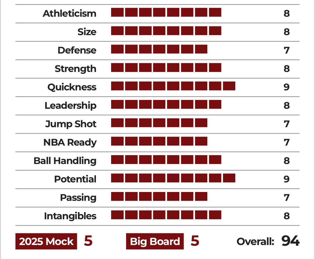 절대적인 ‘1옵션 스코어러’가 되지는 않을 수 있지만, 2차 창출자(secondary creator)나 식스맨 에너지 역할(sixth-man spark plug)로도 큰 성공을 거둘 수 있으며, 장기적으로는 리드가드로 성장할 수 있는 잠재력이 있다.
