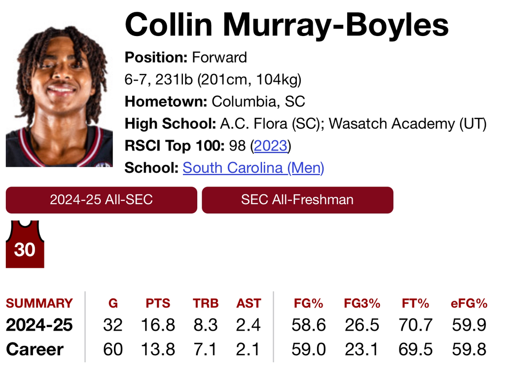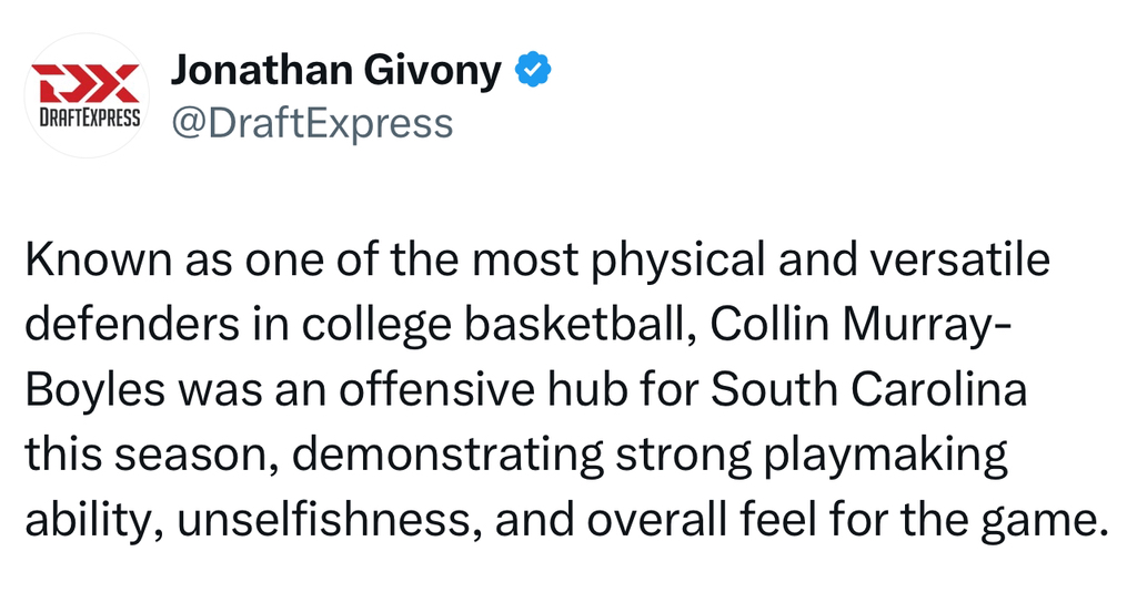 Known as one of the most physical and versatile defenders in college basketball, Collin Murray-Boyles was an offensive hub for South Carolina this season, demonstrating strong playmaking ability, unselfishness, and overall feel for the game. https://t.co/Tgd6UMOYEt pic.twitter.com/SaaLEk02nI