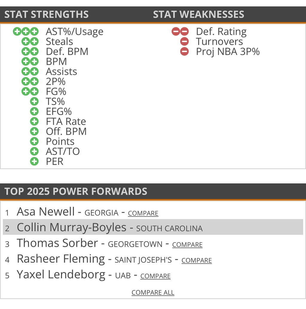 대학 농구에서 가장 피지컬하고 다재다능한 수비수 중 한 명으로 알려진 콜린 머레이-보일스는 이번 시즌 사우스캐롤라이나의 공격 허브였으며, 뛰어난 플레이메이킹 능력, 이타심, 그리고 전반적인 경기 감각을 보여주었습니다. (25/4/15)