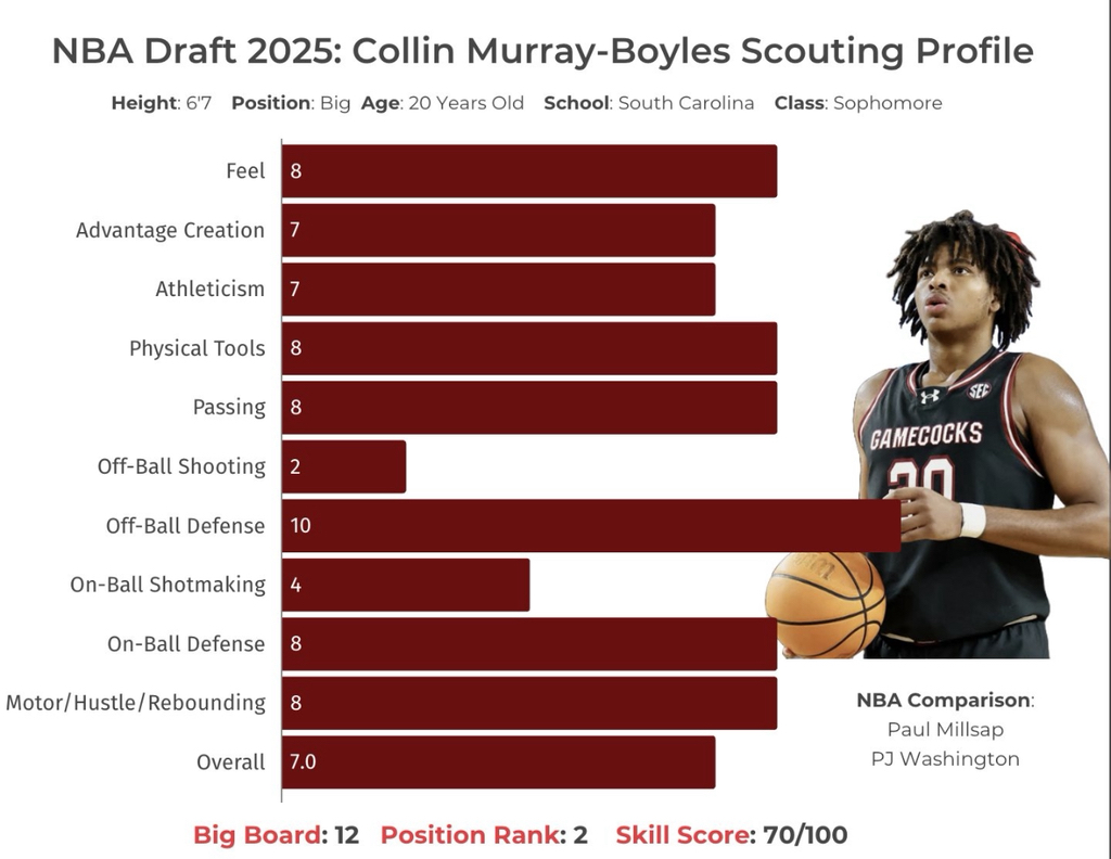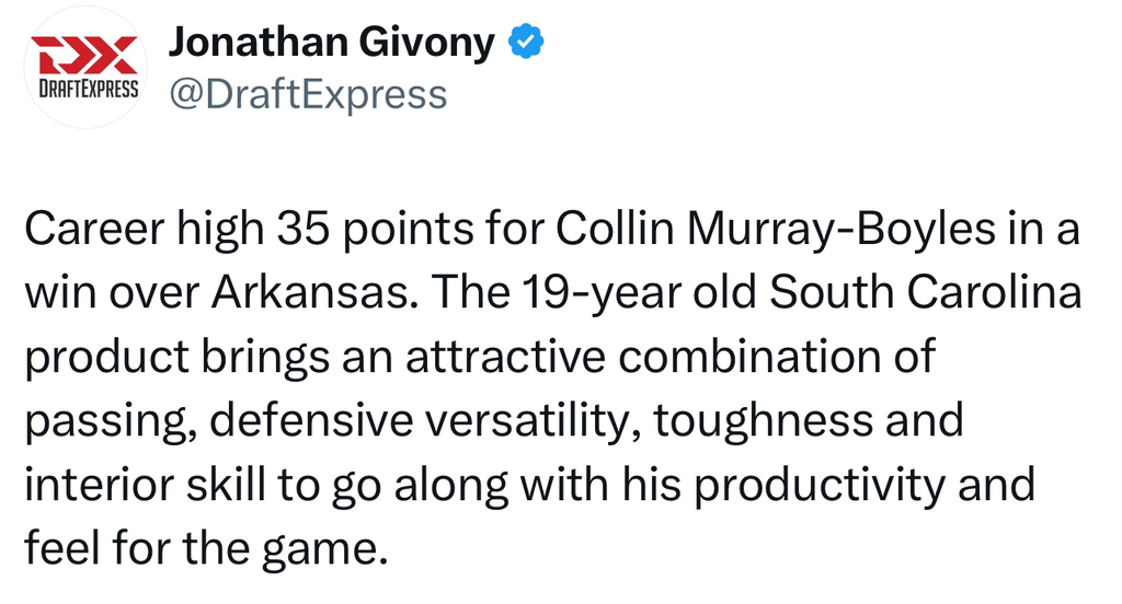 Career high 35 points for Collin Murray-Boyles in a win over Arkansas. The 19-year old South Carolina product brings an attractive combination of passing, defensive versatility, toughness and interior skill to go along with his productivity and feel for the game. pic.twitter.com/BJKu19Zpsz