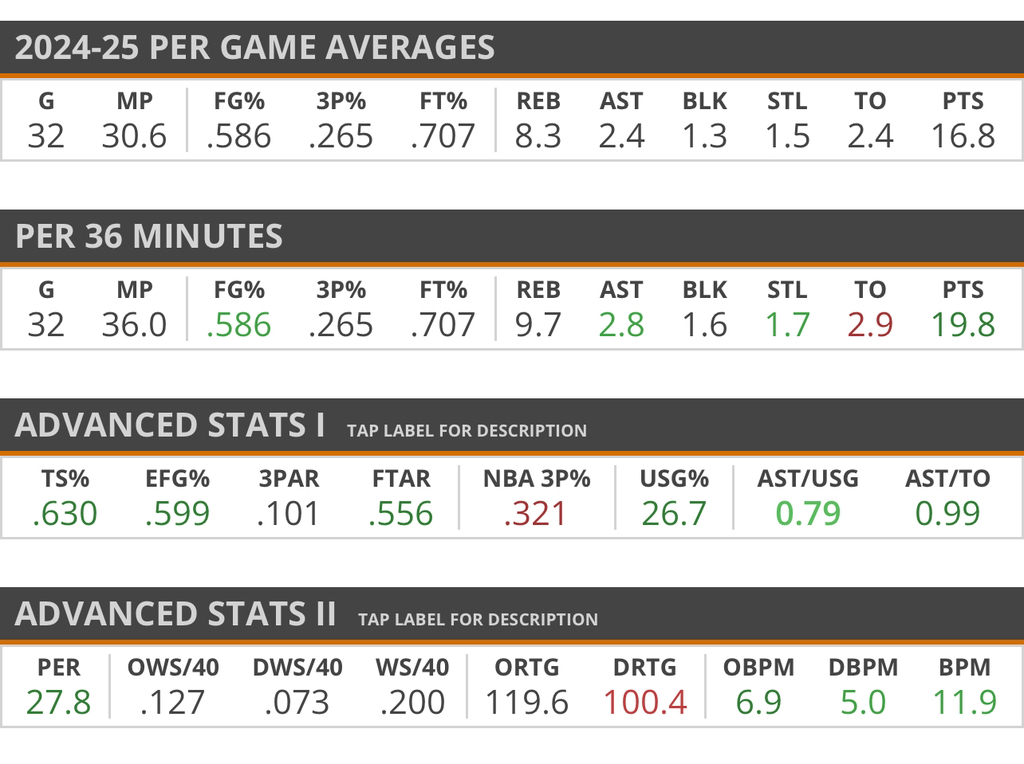 Hoop-Math.com에 따르면 그의 전체 슛 시도 중 75%가 림 근처에서 나왔으며, 이 중 성공률은 66.7%에 그쳤다.