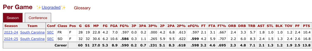 사우스캐롤라이나 대학 2학년 시즌 동안 평균 16.8득점, 8.3리바운드, 2.4어시스트를 기록하며 높은 생산성을 보여줬다.
