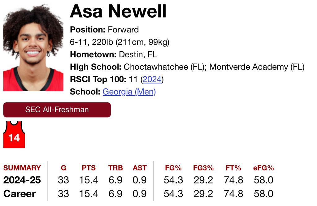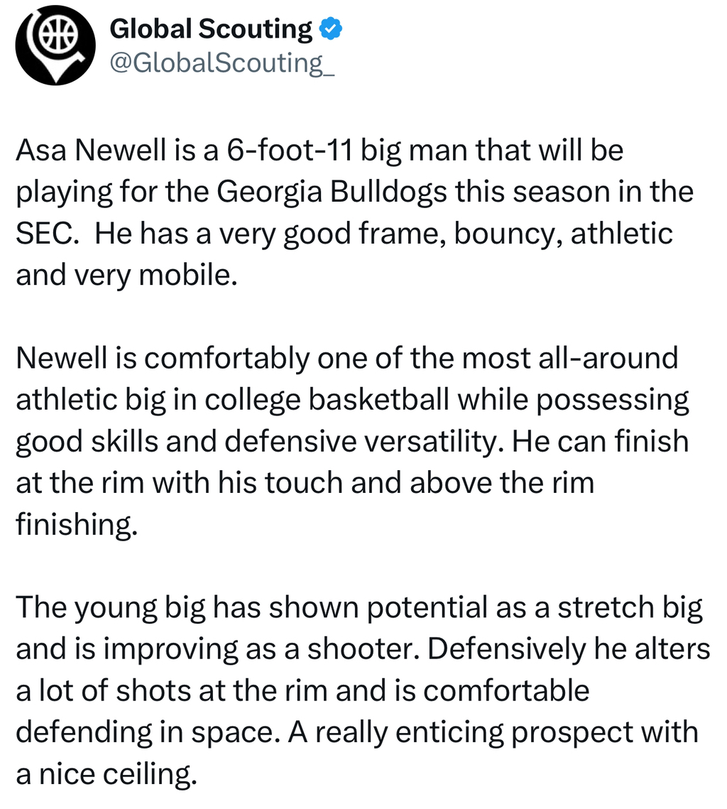 Asa Newell is a 6-foot-11 big man that will be playing for the Georgia Bulldogs this season in the SEC. He has a very good frame, bouncy, athletic and very mobile.