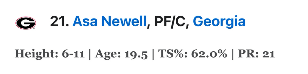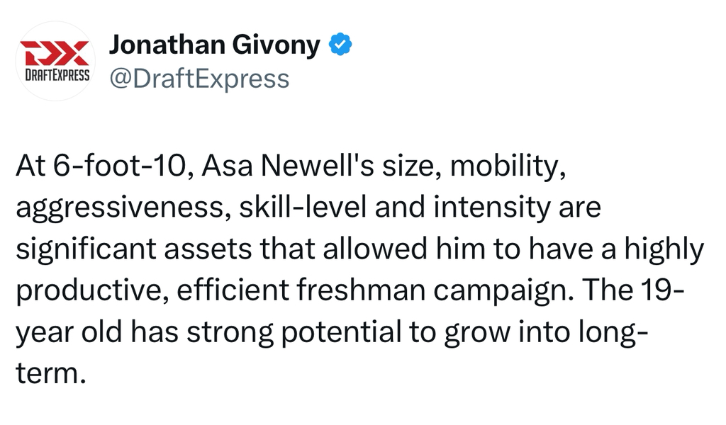 At 6-foot-10, Asa Newell's size, mobility, aggressiveness, skill-level and intensity are significant assets that allowed him to have a highly productive, efficient freshman campaign. The 19-year old has strong potential to grow into long-term. https://t.co/nZR3hPeGI3 pic.twitter.com/ZPa0DWAu9k