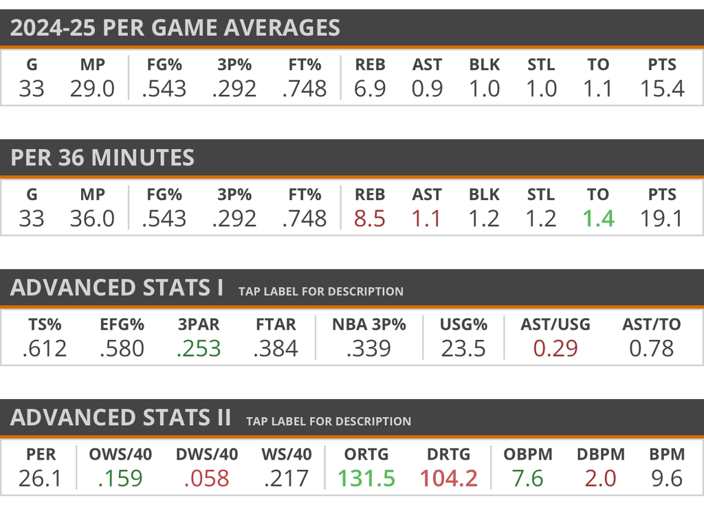 이 젊은 빅맨은 스트레치 빅으로서 잠재력을 보여주었고, 슈터로서도 발전하고 있습니다. 수비적으로는 림에서 슛을 많이 바꿔주고, 공간 수비에도 능숙합니다. 좋은 잠재력을 가진 정말 매력적인 유망주입니다. (24/10/19)