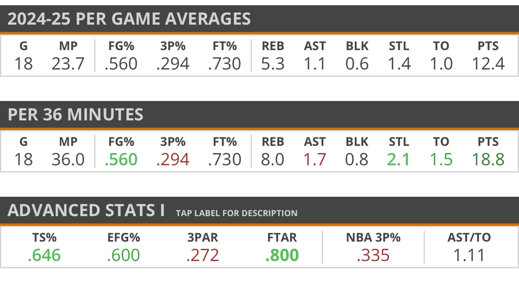 운동 능력, 헌신적인 태도, 포지션 유연성 덕분에 수비 중심의 로테이션 자원으로서 ‘안정적인 하한선(floor)’을 지닌 선수로 평가받는다. 특히 스위치 디펜스를 많이 사용하는 팀 시스템에서 잘 어울릴 수 있다.