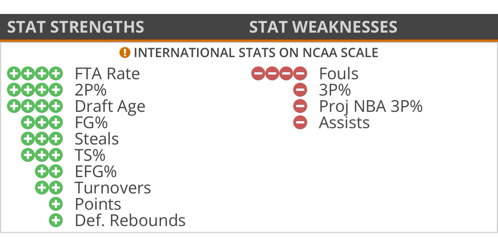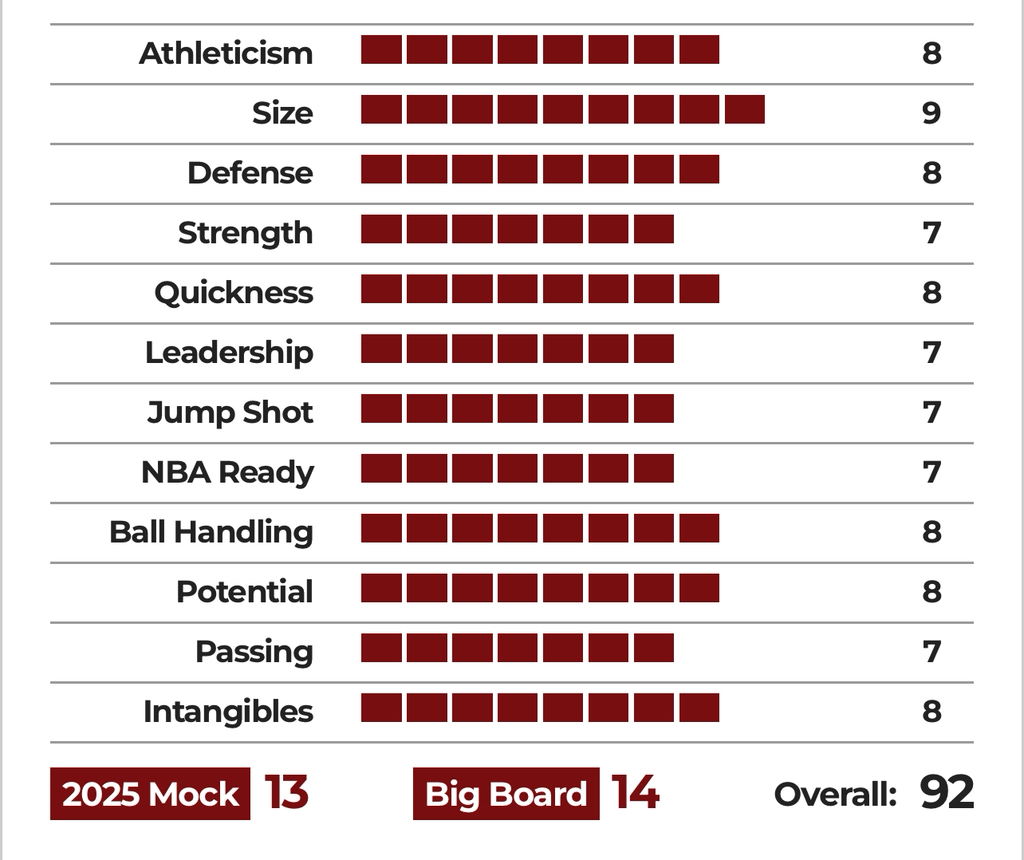 높은 에너지, 경쟁심, 그리고 성장 잠재력 덕분에 드래프트에서는 후반부 로터리 지명 후보로 거론되고 있다.
