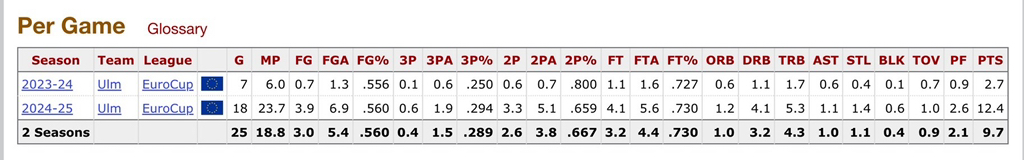 이번 시즌 유로컵에서는 평균 12.4득점 5.3리바운드, 독일 분데스리가(BBL)에서는 평균 9.4득점 4.7리바운드를 기록하며 울름(Ulm)의 핵심 로테이션 선수로 자리 잡았다.