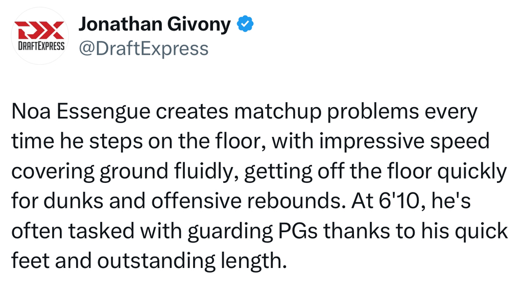 Noa Essengue creates matchup problems every time he steps on the floor, with impressive speed covering ground fluidly, getting off the floor quickly for dunks and offensive rebounds. At 6'10, he's often tasked with guarding PGs thanks to his quick feet and outstanding length. https://t.co/k6BFAc38eg pic.twitter.com/pjsGZX8tQ2