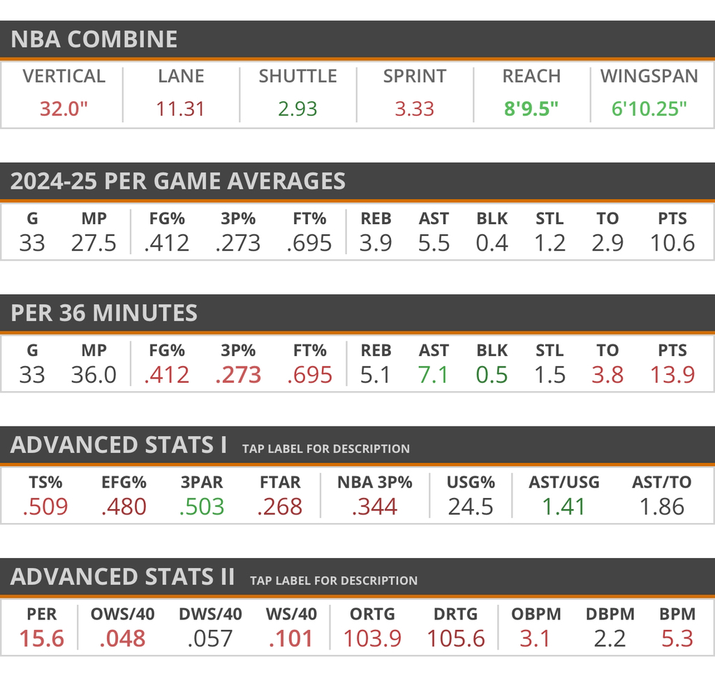볼을 소유할 때 효과적이지만, 오프볼 상황에선 영향력이 크지 않음. NBA에서 볼을 오래 소유할 수 있을 정도의 역량을 보여줄 수 있을지 불투명함.