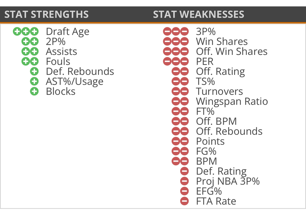 의견이 갈리는 유형의 유망주로, 신입생 시즌 3점 성공률이 27% 에 불과해 외곽 슈팅 능력이 부족함. 전반적인 득점력 또한 다른 상위급 유망주들에 비해 떨어지는 편. 외곽 슛에서 자신감도 부족하고 동작도 부자연스러움.