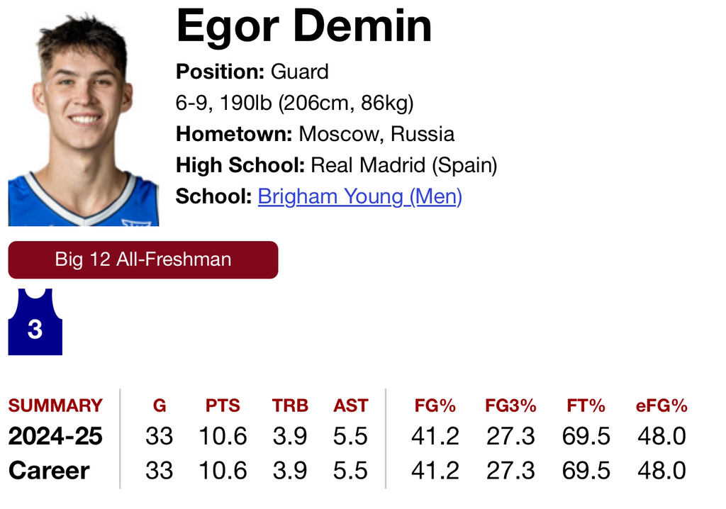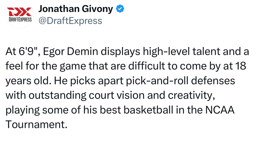 At 6'9", Egor Demin displays high-level talent and a feel for the game that are difficult to come by at 18 years old. He picks apart pick-and-roll defenses with outstanding court vision and creativity, playing some of his best basketball in the NCAA Tournament. https://t.co/xarBVoRTR8 pic.twitter.com/Zcm6ka9c0N