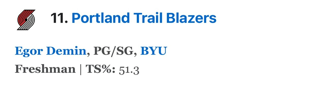 시카고 현지에서는 브리검영 대학(BYU)의 이고르 데민의 주가가 상승하고 있다는 소문이 돌고 있다. 신체 측정 결과도 좋았고, 내가 평소에 프로 데이(performance day)를 크게 신뢰하진 않지만, 오늘 데민은 매우 인상적인 모습을 보여줬다. 지금이 절묘한 타이밍에 맞춰 기량이 정점에 도달하고 있는 듯한 느낌이다. (25/5/16)