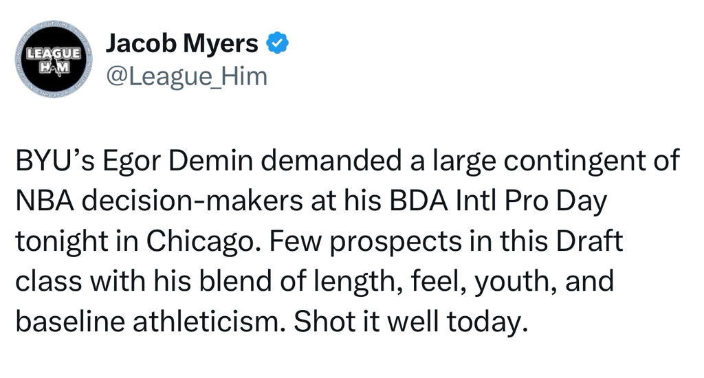 BYU’s Egor Demin demanded a large contingent of NBA decision-makers at his BDA Intl Pro Day tonight in Chicago. Few prospects in this Draft class with his blend of length, feel, youth, and baseline athleticism. Shot it well today. pic.twitter.com/p6LcKIRNVS