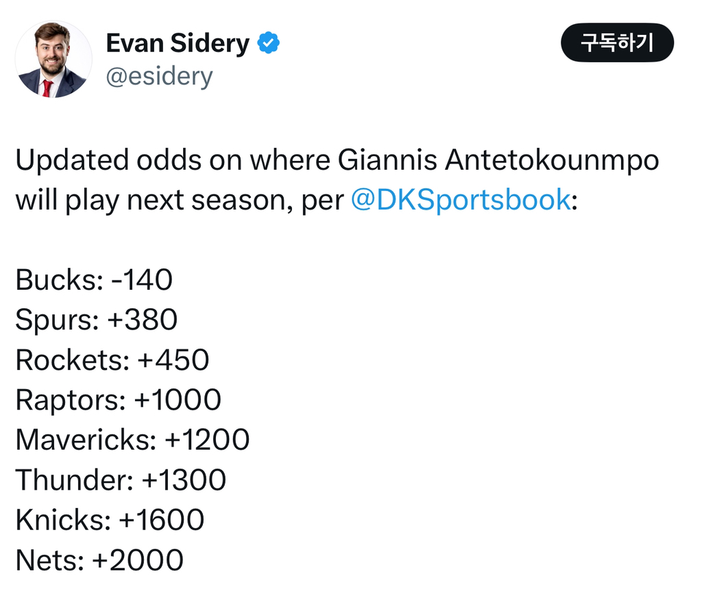 [MIL] 야니스 아테토쿤보의 차기 시즌 소속팀 배당률 작성자(CHI)불타는개고기|작성시간25.06.03|조회수2,390 목록 댓글 6 글자크기 작게가 글자크기 크게가 https://x.com/esidery/status/1929608566937170003?s=46&t=ZnclgswjWbGLdrsx0Y9Zvg 다음검색 현재 게시글 추가 기능 열기 북마크 공유하기 신고 센터로 신고 댓글 댓글 6 댓글쓰기 답글쓰기 댓글 리스트 작성자에이스유통에이스 | 작성시간 25.06.03 레이커스 작성자Hornets | 작성시간 25.06.03 의외로 브룩클린이 낮네요. 작성자LegendDuncan | 작성시간 25.06.03 스퍼스 오는거야? 쿠퍼플래그보단 쿰보지 쿰보야 어서오렴ㅎㅎ 작성자AIR JORDAN | 작성시간 25.06.04 스퍼스 트윈타워의 추억이 새록새록ㅋ 작성자으흔 | 작성시간 25.06.04 스퍼스 진심된다면 어마어마할듯 댓글 전체보기