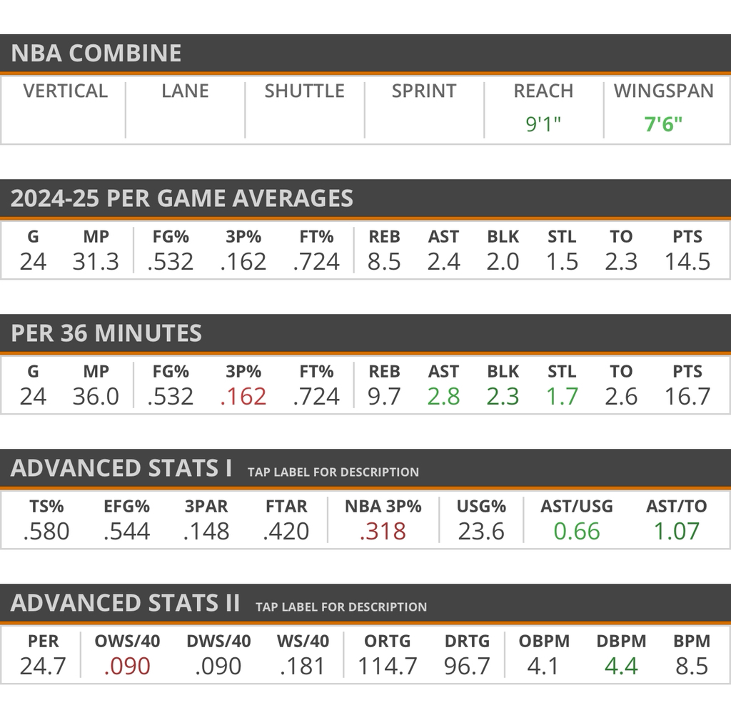 - 사이즈 & 피지컬: 208cm, 119kg, 윙스팬 약 229cm. 큰 프레임과 하체 힘으로 골밑 장악.