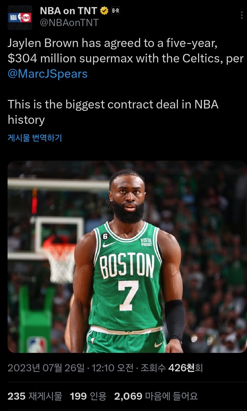 브라운은 2023년 7월에 당시 NBA 역사상 최고액 계약인 5년 2억 8,500만 달러(한화 약 3,900억 원) 규모의 계약을 체결했으며, 이는 그를 2028-29 시즌까지 보스턴에 남게 할 예정이었습니다. 이 계약은 이후 제이슨 테이텀이 1년 뒤 5년 3억 1,400만 달러 계약을 체결하면서 최고액 타이틀을 넘겨주긴 했습니다.