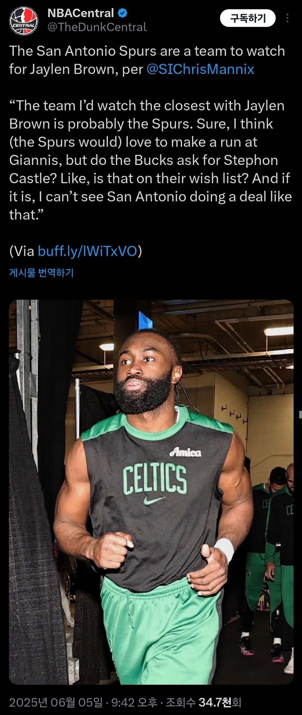 **크리스 매닉스(Chris Mannix)**의 보도에 따르면, 샌안토니오 스퍼스는 보스턴 셀틱스의 스타 제일런 브라운(Jaylen Brown)을 영입하기 위한 이번 오프시즌의 유력 후보 중 하나로 언급되고 있습니다. 물론, 그가 실제로 트레이드 시장에 나온다는 전제 하에서 말이죠.