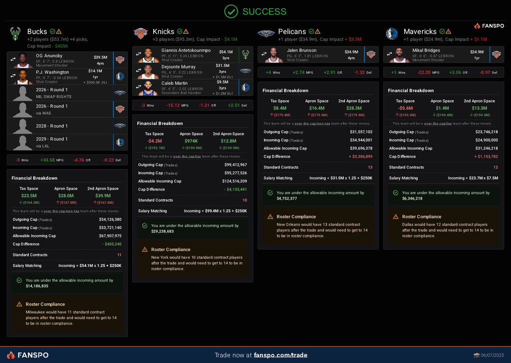 닉스는 원하는대로 브런슨+og+미칼+픽 ???쓰면서 쿤보 디존테 머레이,마틴까지 득, 물론 리스크는 머레이 받는거긴 합니다. 아킬부상 전적이고, 빨리 돌아와도 1년이고 근데 브런슨 보내는만큼 PG 보강은 필수로 보여서 이삼년 쇼부본다고 했을때 이년뒤까지는 계산해본 시나리오 라인업, 샐러리는 맞습니다.
