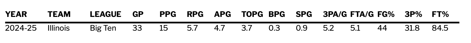 볼스크린 상황에서 읽어내는 능력이 환상적이다. 올 시즌 톰 이비시치와 최고의 콤비 플레이를 보여주며 팝, 롤, 풀업 등 다양한 옵션으로 연결했다. 일리노이에서는 스택 픽앤롤 세트를 자주 활용했는데, 야쿠치오니스가 이비시치나 벤 험리커스를 찾아주는 동시에 직접 림어택을 전개하는 데 최적이었다. 페이스 조절이 탁월해 수비를 흔들고 틈을 만든다. 인사이드아웃 드리블이나 헤지테이션으로 수비수를 주저하게 만든 뒤 공간을 확보하는 능력이 뛰어나다.라이브 드리블 패싱의 천재
