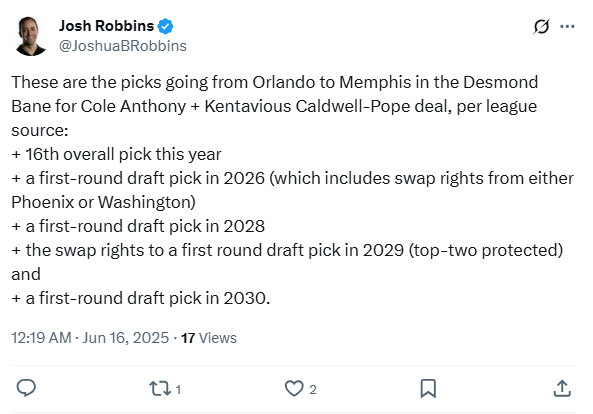 올랜도가 데스먼드 베인 트레이드에 쓴 드래프트픽 정보 작성자Melo|작성시간25.06.16|조회수1,504 목록 댓글 2 글자크기 작게가 글자크기 크게가 올해 1라운드 16픽 2026년 1라운드 지명권 (피닉스 또는 워싱턴과의 스왑권리 포함) 2028년 1라운드 지명권 2029년 1라운드 지명권 스왑 권리 (Top2 보호) 2030년 1라운드 지명권https://x.com/JoshuaBRobbins/status/1934269665531871721 다음검색 현재 게시글 추가 기능 열기 북마크 공유하기 신고 센터로 신고 댓글 댓글 2 댓글쓰기 답글쓰기 댓글 리스트 작성자Melo-Drama | 작성시간 25.06.16 댓가가 비싸네요 흠… 작성자데미아니 | 작성시간 25.06.16 매직이 선수들이 오고 싶지 않은 팀인가. 웃돈주고 겨우 데려온 느낌이네 댓글 전체보기