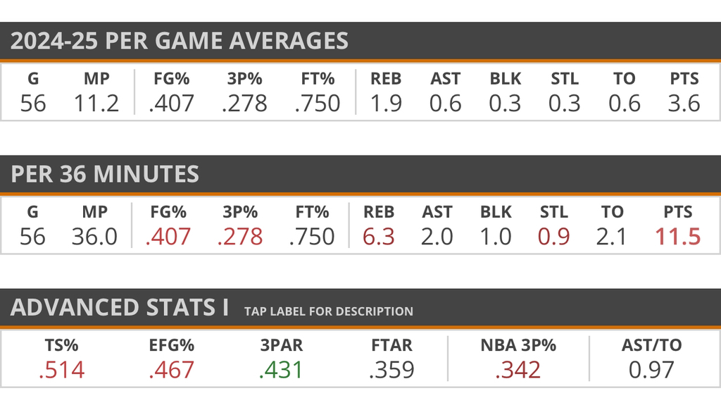 - 제한된 시도이긴 하지만 픽앤롤 볼 핸들러로서도 가능성을 보이며, 포제션당 1.0점, 78번째 퍼센타일 기록