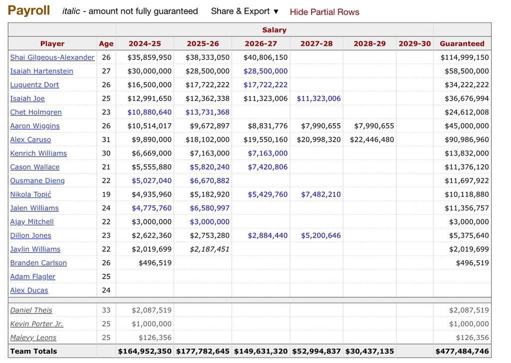 2025-26 시즌 기준으로는 1차 및 2차 에이프런을 넘을 우려는 없지만, 향후 길져스-알렉산더, 쳇 홈그렌, 제일런 윌리엄스와의 계약 연장으로 인해 8억 달러 이상의 지출이 예정되어 있고, 결국 썬더는 로스터 구조에 변화를 줄 수밖에 없게 된다. 올해 및 내년의 1라운드 픽을 제외하더라도, 썬더는 2026-27 시즌에 사치세 라인을 넘고 2차 에이프런 기준으로도 약 500만 달러 초과할 것으로 예상된다.