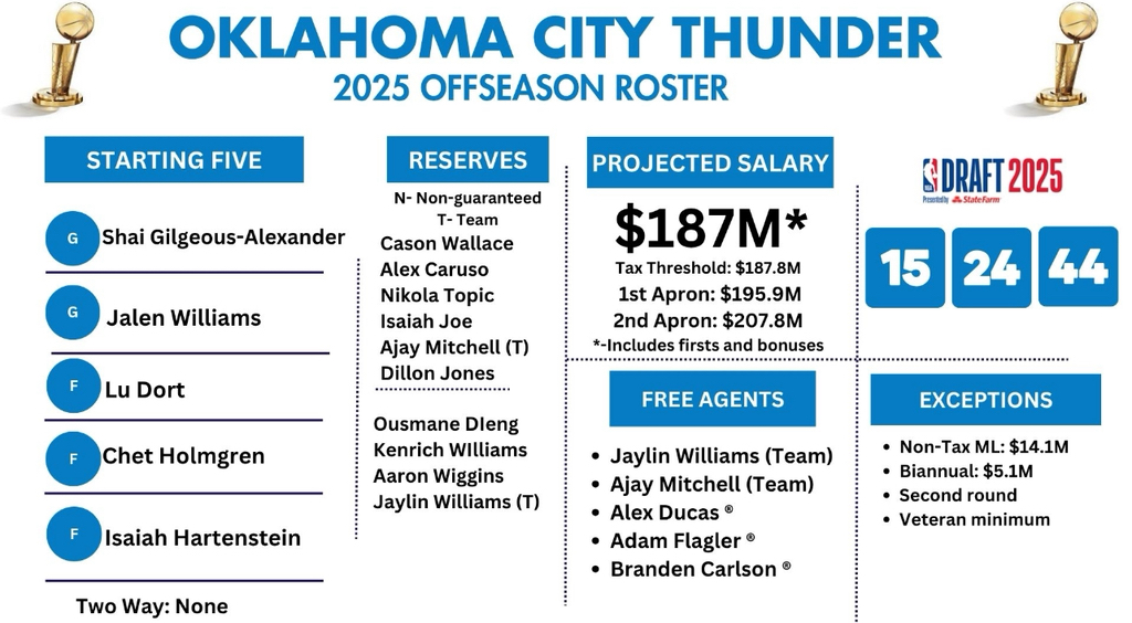 길져스-알렉산더의 연장 계약은 2027-28 시즌부터 시작되기 때문에, 현재로선 썬더는 5,200만 달러 규모의 비보장 계약(루 도트, 아이재아 하텐슈타인 포함)을 통해 재정적 유연성을 유지하고 있다. 덕분에 썬더는 FA 시장에서 미니멈 계약만을 고집할 필요가 없다. 오클라호마시티는 향후 2년간 최대 6장의 1라운드 픽(이번 드래프트 2장, 2026년에 4장)을 보유할 수 있다.