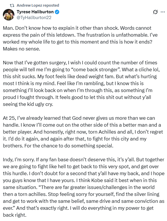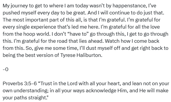 내가 여기까지 온 여정은 우연이 아니었어. 나는 매일 스스로를 밀어붙였고, 앞으로도 그럴 거야. 이 모든 것 중에서 가장 중요한 건, 내가 감사함을 느끼고 있다는 거야. 나를 여기까지 데려다 준 모든 경험에 감사해. 농구계를 통해 받은 모든 사랑에 감사해. 난 “이걸 겪어야만” 하는 게 아니야. “이걸 겪을 수 있는” 기회를 얻은 거야. 앞으로 펼쳐질 여정에도 감사하고 있어. 내가 어떻게 돌아오는지 지켜봐 줘. 시간이 좀 걸리겠지만, 나는 다시 일어나 최고의 타이리스 할리버튼이 될 거야.