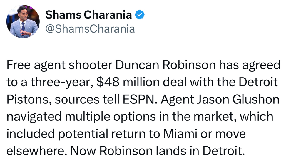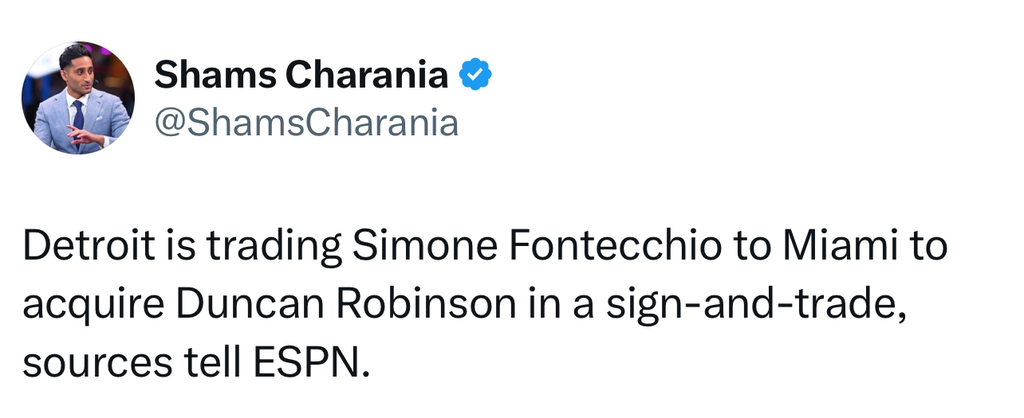 [DET/MIA] 던컨 로빈슨, Pistons와 3년 48밀 계약 합의, 시모네 폰테키오는 사인 앤 트레이드로 Heat 행 작성자(CHI)불타는개고기|작성시간25.07.02|조회수699 목록 댓글 2 글자크기 작게가 글자크기 크게가 https://x.com/shamscharania/status/1940169377350844832?s=46&t=ZnclgswjWbGLdrsx0Y9Zvg사트로 시모네 폰테키오는 Heat 행https://x.com/shamscharania/status/1940169708449259844?s=46&t=ZnclgswjWbGLdrsx0Y9Zvg 다음검색 현재 게시글 추가 기능 열기 북마크 공유하기 신고 센터로 신고 댓글 댓글 2 댓글쓰기 답글쓰기 댓글 리스트 작성자세트오펜스 | 작성시간 25.07.02 돈복 많은놈 ㅠ.ㅠ 작성자R.WALLAS | 작성시간 25.07.02 양아들 잘가 댓글 전체보기
