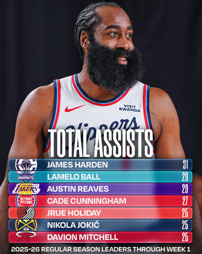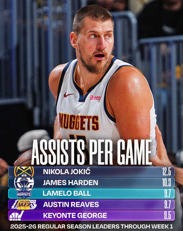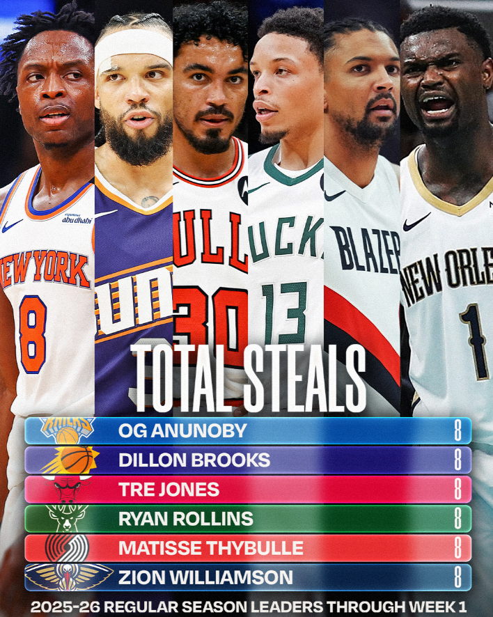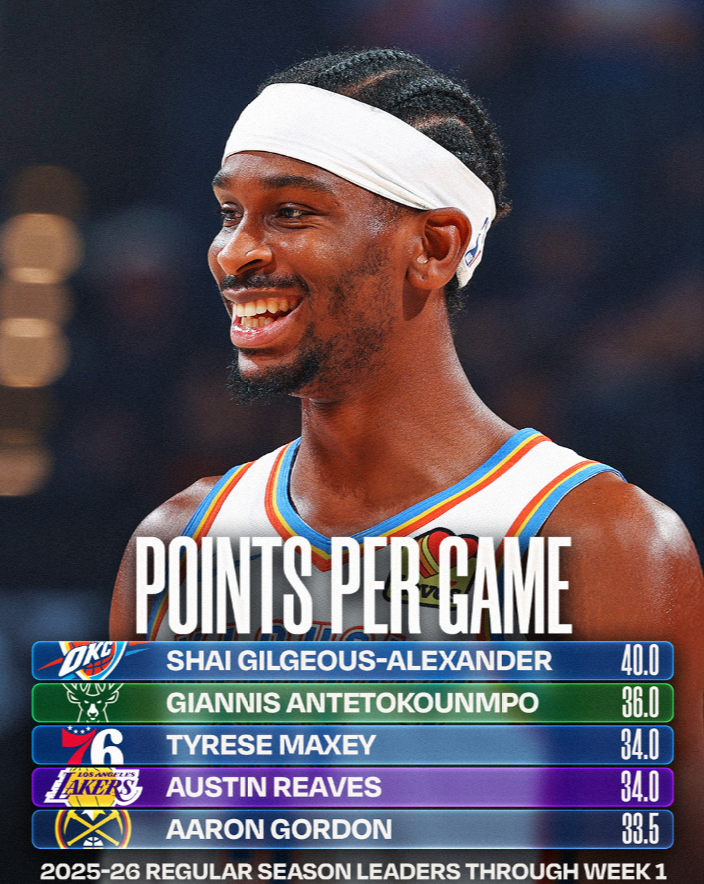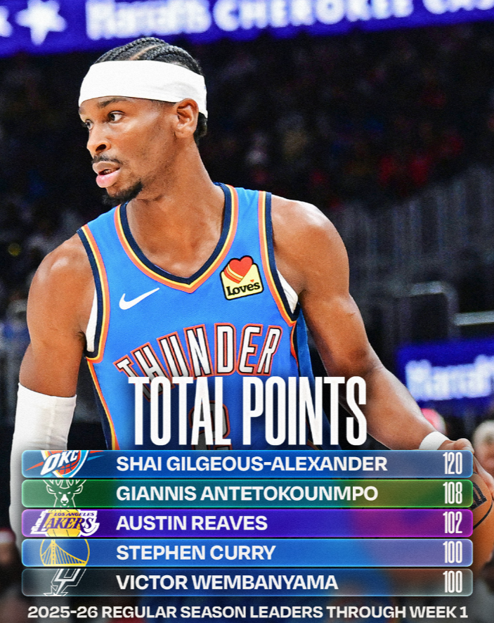 NBA 25-26시즌 1주차 스탯 리더 작성자Melo|작성시간25.10.28|조회수2,141 목록 댓글 7 글자크기 작게가 글자크기 크게가 득점 1위 : 샤이 길저스-알렉산더 리바운드 1위 : 야니스 아테토쿤보 어시스트 1위 : 니콜라 요키치 스틸 1위 : 트레 존스, 자이언 윌리엄슨 블락 1위 : 빅터 웸반야마 다음검색 현재 게시글 추가 기능 열기 북마크 공유하기 신고 센터로 신고 댓글 댓글 7 댓글쓰기 답글쓰기 댓글 리스트 작성자vocal0171 | 작성시간 25.10.28 이제 어시 1위에 저 곰 아저씨는 아무도 관심을 주지 않... ㅋㅋㅋ 답댓글 작성자CANIS | 작성시간 25.10.28 포가가 어시 많이 해야죠 당연한걸요 답댓글 작성자agang | 작성시간 25.10.28 당연한거라ㅋㅋㅋ 작성자어빙신 | 작성시간 25.10.28 ㅋㅋㅋㅋㅋㅋㅋㅋㅋㅋㅋ 작성자고양이목에쥐달기 | 작성시간 25.10.28 2k 게임 기록도 이렇지는 않던데.. 댓글 전체보기