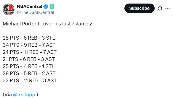 마이클 포터 주니어의 최근 7경기 스탯 작성자Melo|작성시간25.11.19|조회수2,246 목록 댓글 8 글자크기 작게가 글자크기 크게가 마이클 포터 주니어는 덴버에서 345경기를 뛰는 동안 7어시스트를 한 경기가 없었는데 브루클린에서 2경기 연속 7어시스트 기록 다음검색 현재 게시글 추가 기능 열기 북마크 공유하기 신고 센터로 신고 댓글 댓글 8 댓글쓰기 답글쓰기 댓글 리스트 작성자꽃e피면나b | 작성시간 25.11.20 결국 약팀 가야지 잘할스타일. 작성자King james | 작성시간 25.11.20 마포주 작성자농구좋아ㅎ | 작성시간 25.11.20 터지나요?! 작성자희지니 | 작성시간 25.11.20 덴버에선 도대체 왜 그런거냐? ㅠㅠ 작성자Nikola Jokic | 작성시간 25.11.20 나가면 터질줄 알았죠 댓글 전체보기