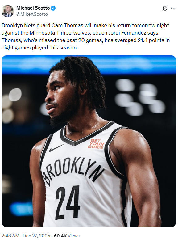 브루클린 네츠의 가드 캠 토마스가 내일 밤 미네소타 팀버울브스와의 경기에서 복귀할 예정이라고 조르디 페르난데스 감독이 밝혔습니다. 지난 20경기에 결장했던 토마스는 이번 시즌 8경기에서 평균 21.4득점을 기록했습니다.