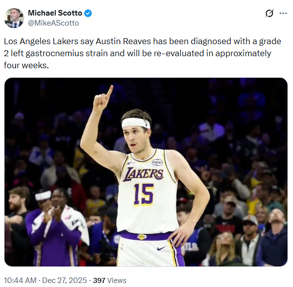오스틴 리브스 - Grade 2 비복근 염좌로 최소 4주 결장 작성자Melo|작성시간2시간 31분 전|조회수191 목록 댓글 4 글자크기 작게가 글자크기 크게가 LA 레이커스 가드 오스틴 리브스가 Grade 2왼쪽 비복근 염좌 진단을 받았으며, 4주 후 재평가를 받을 예정이다.https://x.com/MikeAScotto/status/2004729967922610536https://x.com/ShamsCharania/status/2004729613759775111 다음검색 현재 게시글 추가 기능 열기 북마크 공유하기 신고 센터로 신고 댓글 댓글 4 댓글쓰기 답글쓰기 댓글 리스트 작성자태섭 | 작성시간 1시간 44분 전 new 망했네 ㅠㅠ 작성자디트로이트 | 작성시간 1시간 31분 전 new 혹사시킨다더니 부상... 작성자루카 돈치치 | 작성시간 59분 전 new 개망 작성자LeBron James | 작성시간 44분 전 new 망 댓글 전체보기
