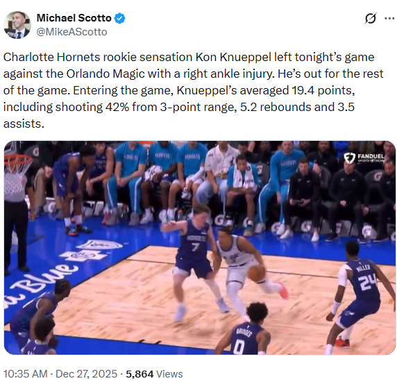 [뉴스]콘 크니플 - 발목 부상으로 오늘 경기 복귀 X 작성자Melo|작성시간2시간 9분 전|조회수103 목록 댓글 0 글자크기 작게가 글자크기 크게가 https://x.com/MikeAScotto/status/2004727694286881101 다음검색 현재 게시글 추가 기능 열기 북마크 공유하기 신고 센터로 신고 댓글 댓글 0 댓글쓰기 답글쓰기 댓글 리스트
