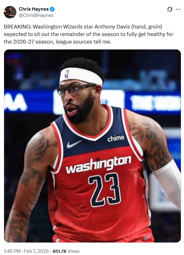 앤서니 데이비스, 잔여 시즌 아웃 예정 작성자Jason-Kidd|작성시간26.02.07|조회수4,835 목록 댓글 19 글자크기 작게가 글자크기 크게가 2026-27 시즌을 위해 완전한 회복에 전념하기 위해 남은 시즌을 결장할 것으로 예상된다고... 이 부상이.. 이렇게.. 다음검색 현재 게시글 추가 기능 열기 북마크 공유하기 신고 센터로 신고 댓글 댓글 19 댓글쓰기 답글쓰기 댓글 리스트 작성자스파이크 | 작성시간 26.02.08 건강하다면.. 영 갈매기도 기대가 되네요 작성자new독고탁 | 작성시간 26.02.08 어빙 쿠퍼 갈매기 조합은 가동도못해보고 작성자카이레이 | 작성시간 26.02.08 부산으로와라. 부산팀이름이 뭐였지요 작성자데미아니 | 작성시간 26.02.08 팩트는 이렇게 관리해줘도 내년에 대부분 누울거라는거 작성자씩스맨 | 작성시간 26.02.08 구단이랑 몰래 합의가 된 건지도 모르겠네요 댓글 전체보기