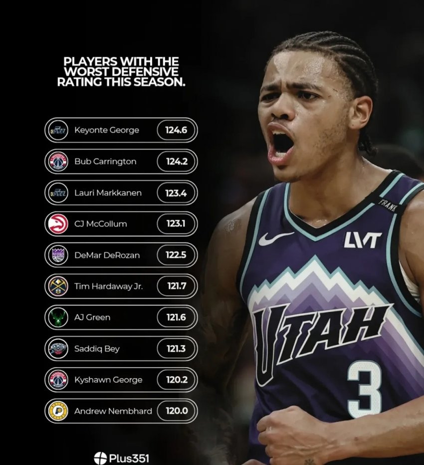 작성자gabage time 작성시간 26.02.13 개인 수비력이 나쁜 선수들도 있지만 팀 수비의 나쁜 지표가 영향을 줬다고 봐야죠. 키션 조지, 앤드류 넴하드는 개인 수비력은 준수한 선수들입니다.